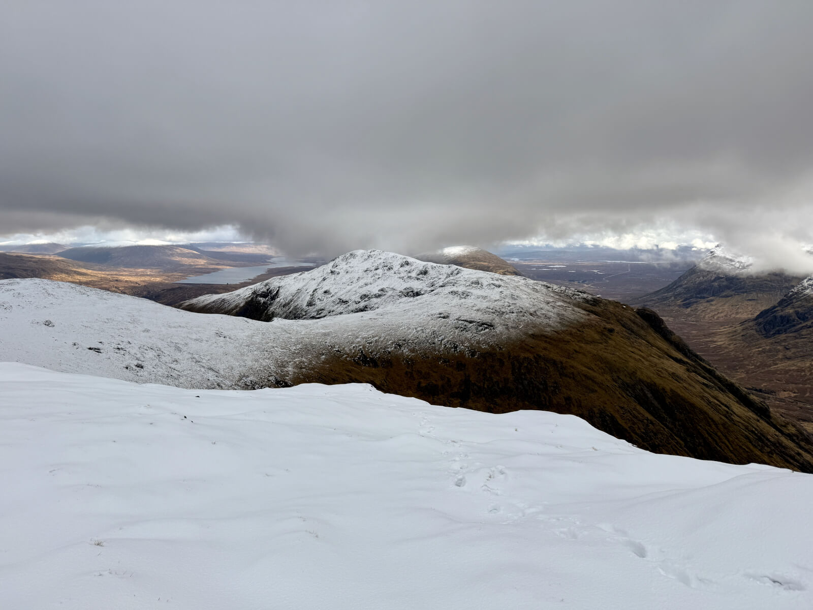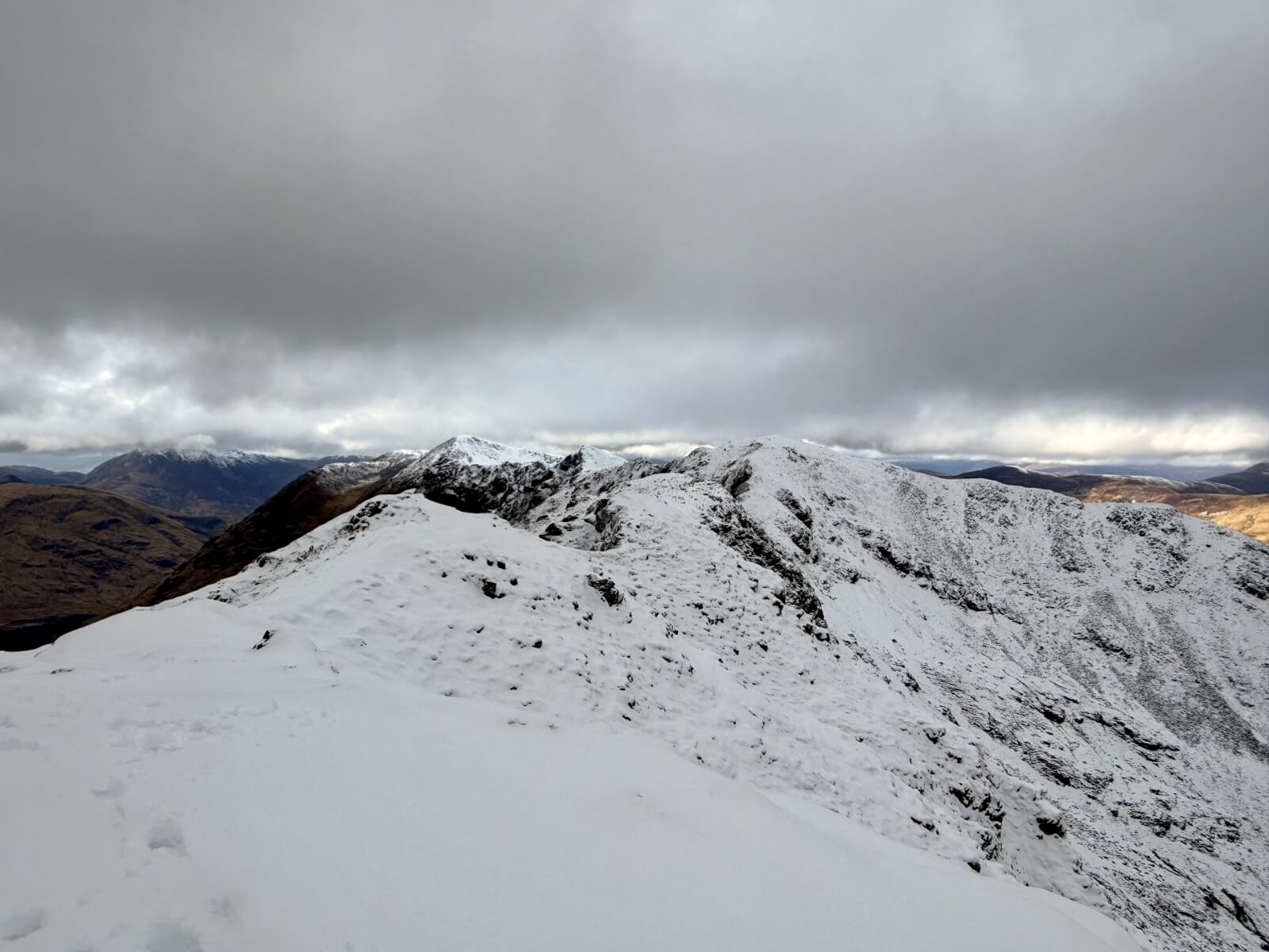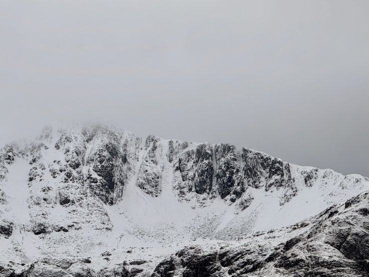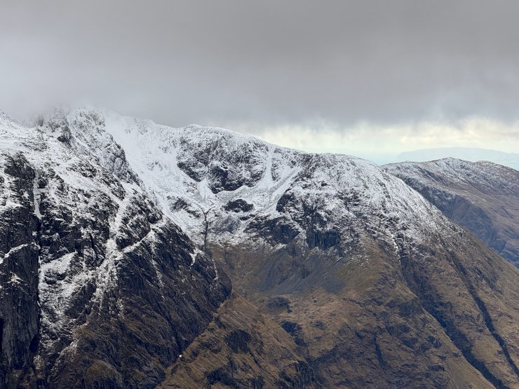 Looking along the Aonach Eagach ridge from Am Bodach. Significantly more snow on the North side than the South side, yesterday’s blog shows the South side as a comparison.