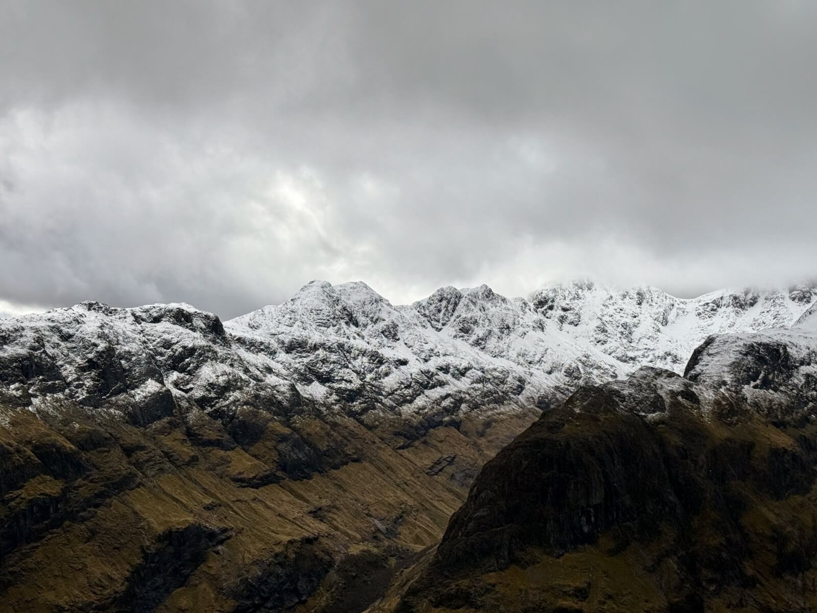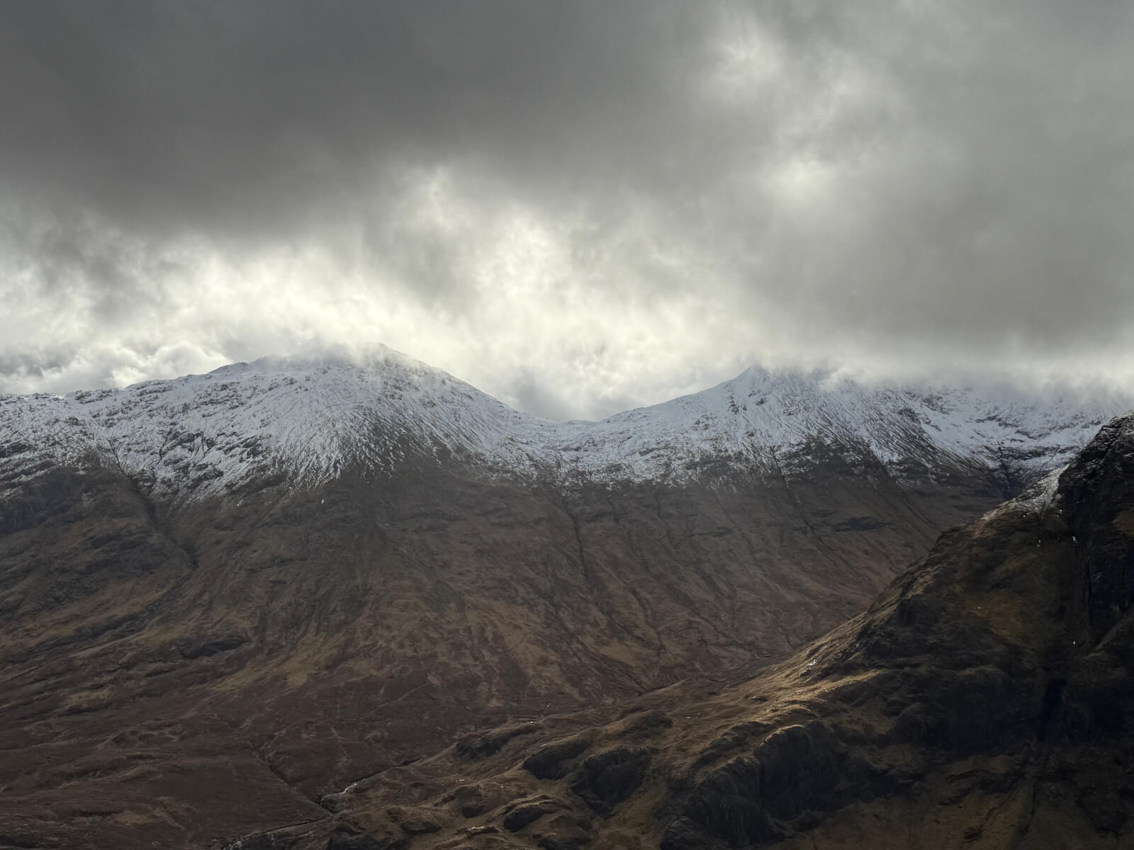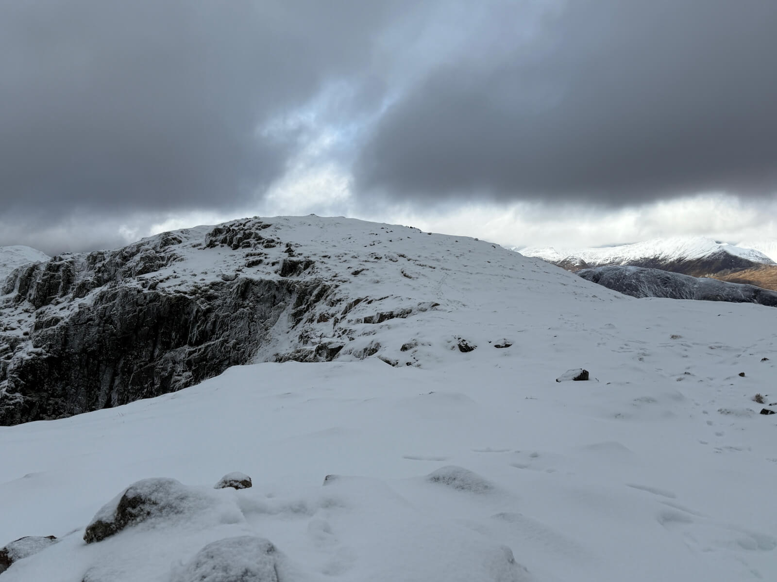 Looking along the Aonach Eagach ridge from Am Bodach. Significantly more snow on the North side than the South side, yesterday’s blog shows the South side as a comparison.