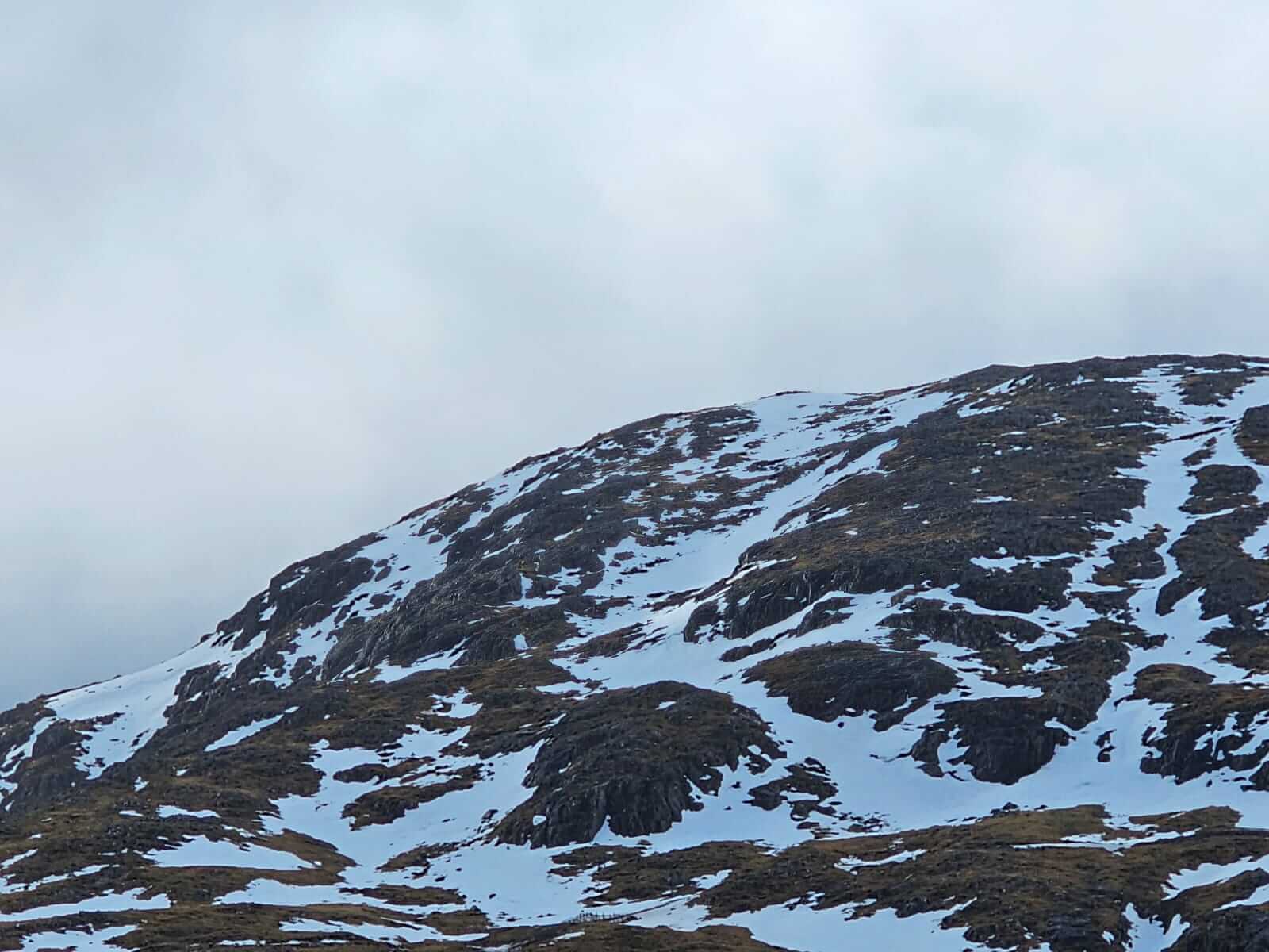 Given that it’s been very changeable today with cloudy summits, heavy rain showers and some brighter spells, it felt a little bit like hide and seek heading up the Glen to see what patchy snow remained from yesterday’s very wet and mild conditions. Whilst many aspects are all but bare, during brighter spells with summit views, it was pleasantly surprising that North and North-East aspects continue to hold some more sizeable patches (possibly even usable) above 850 metres.