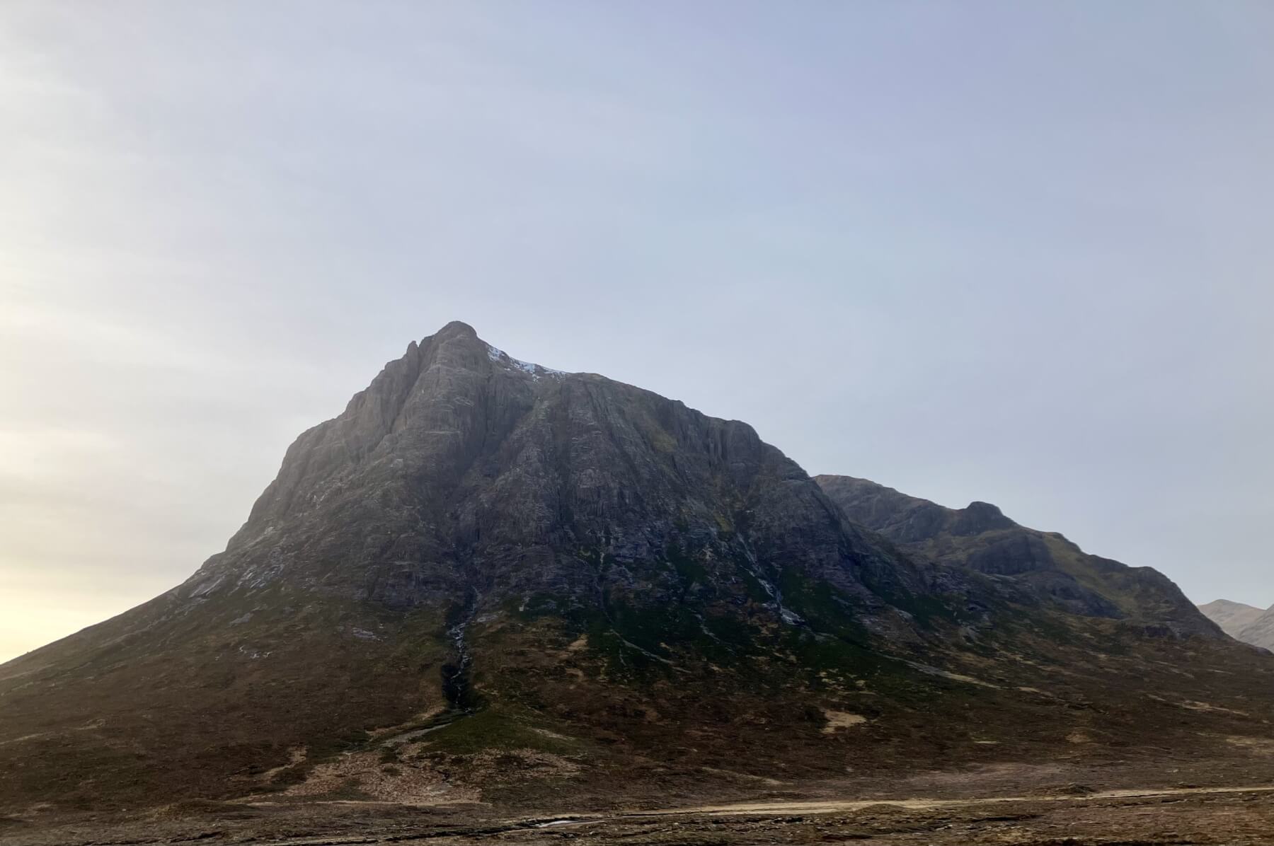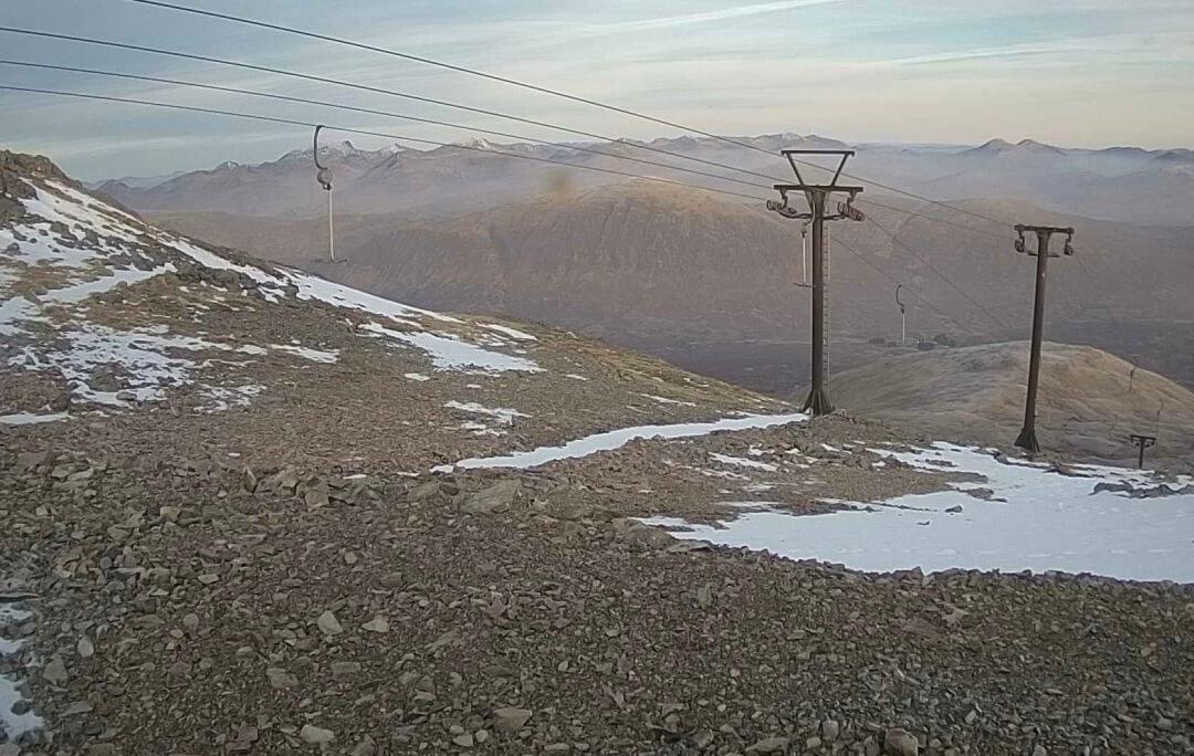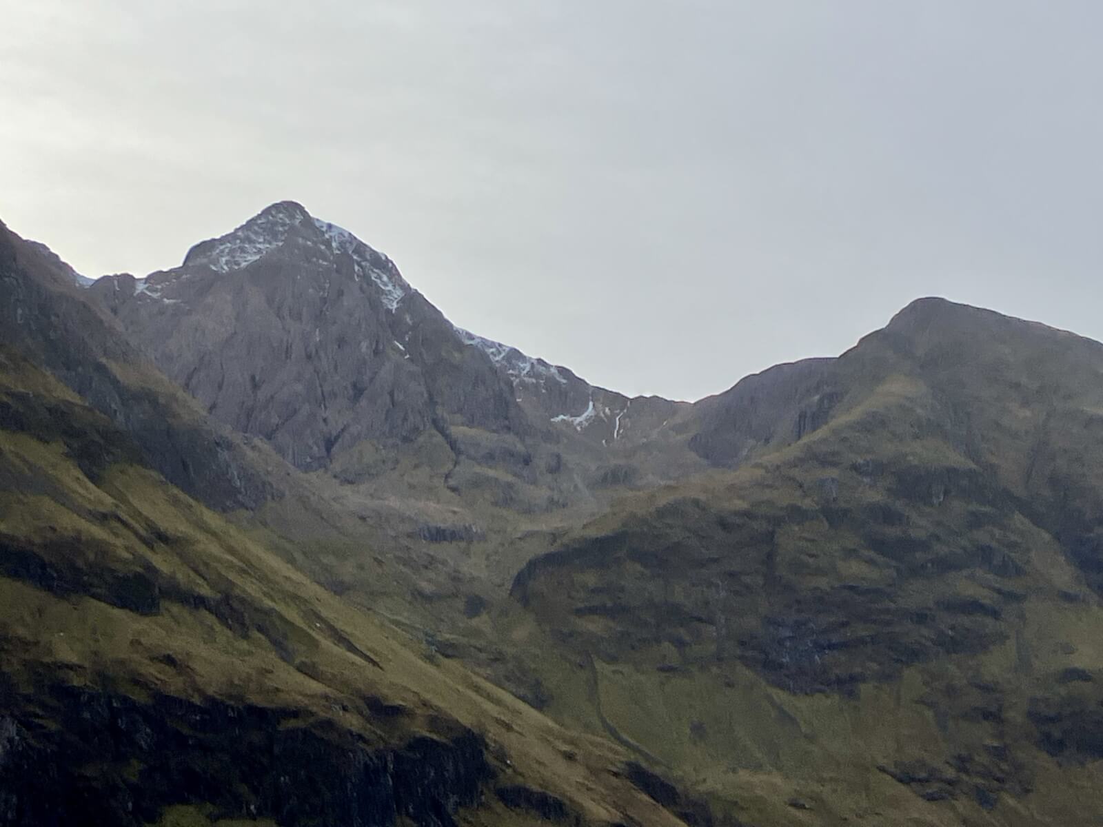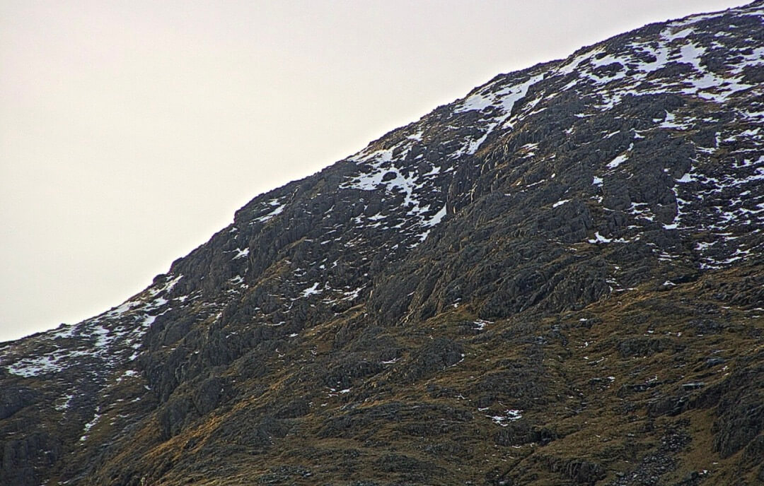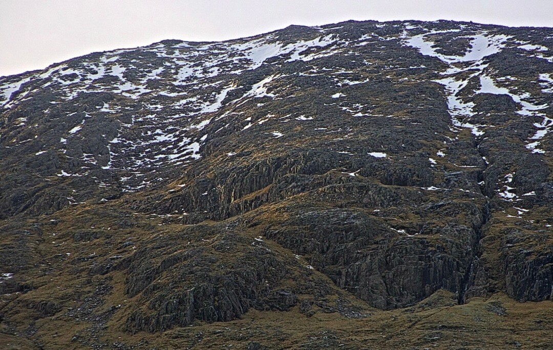 After another frosty night it was dry with some high cloud cover, winds were very light and variable in direction. It was minus 0.7 at 870 metres. Paths, hillsides and rocks are quite icy underfoot. The snowpack remains very patchy, all snow areas are frozen, well bonded, firm and icy. Largest expanses remain on North to East aspects mostly above 950 metres, particularly in sheltered gullies and hollows.