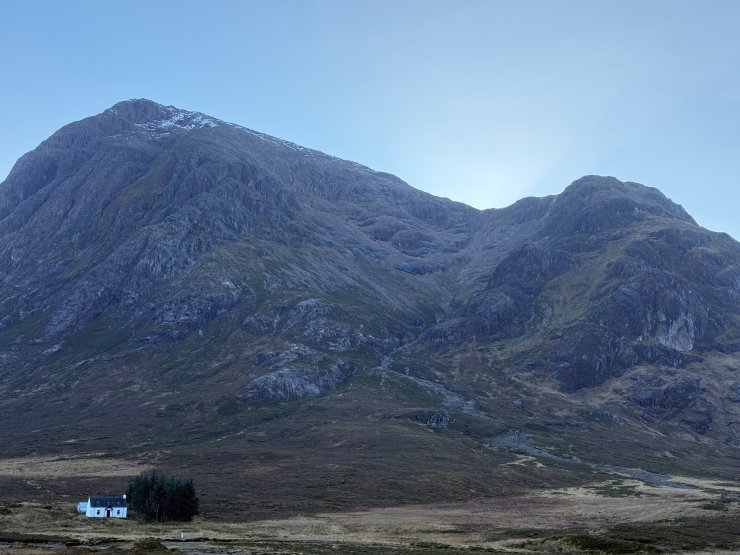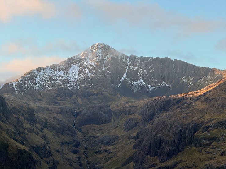 Clear sunny conditions gave a good chance to have a look around at what snow remains in Glencoe. While some hills have very little snow, the highest hills still have some large areas of snow. The snow that remains has refrozen and is very firm and mainly on steep ground with serious slopes onto rocks below. There was also verglas (a thin layer of ice) on some rocks, particularly in shady areas, on the higher summits.