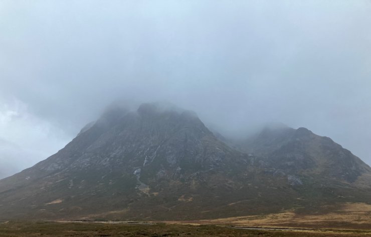 Stob Mhic Mhartuin the little pointed peak on the right the Devil’s Staircase goes through the shallow v on its righthand side. Sron a’ Choire Odhair-bhig in the clouds.