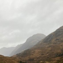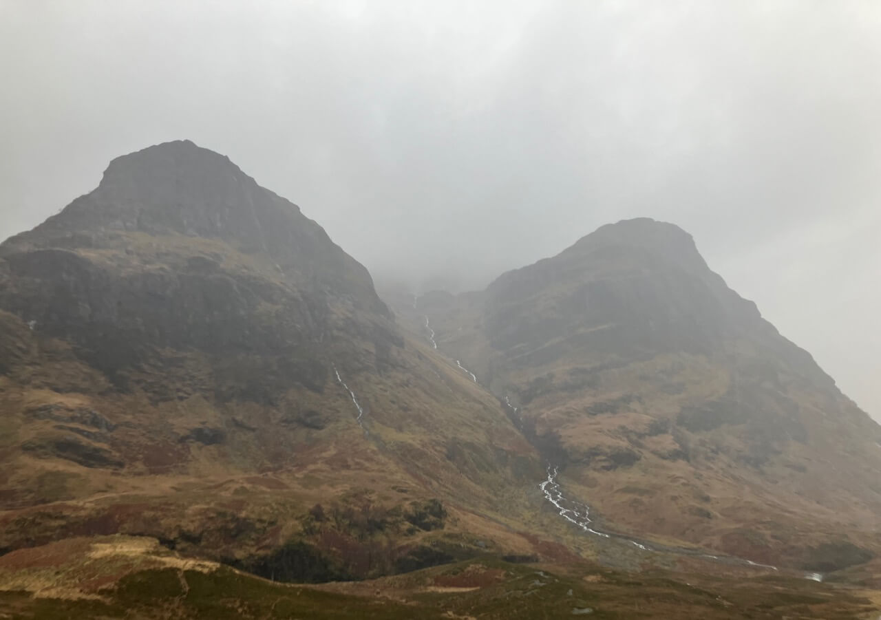 Gearr Aonach and Aonach Dubh with Stob Coire nan Lochan in the clouds. Plenty of rain water running off these peaks.