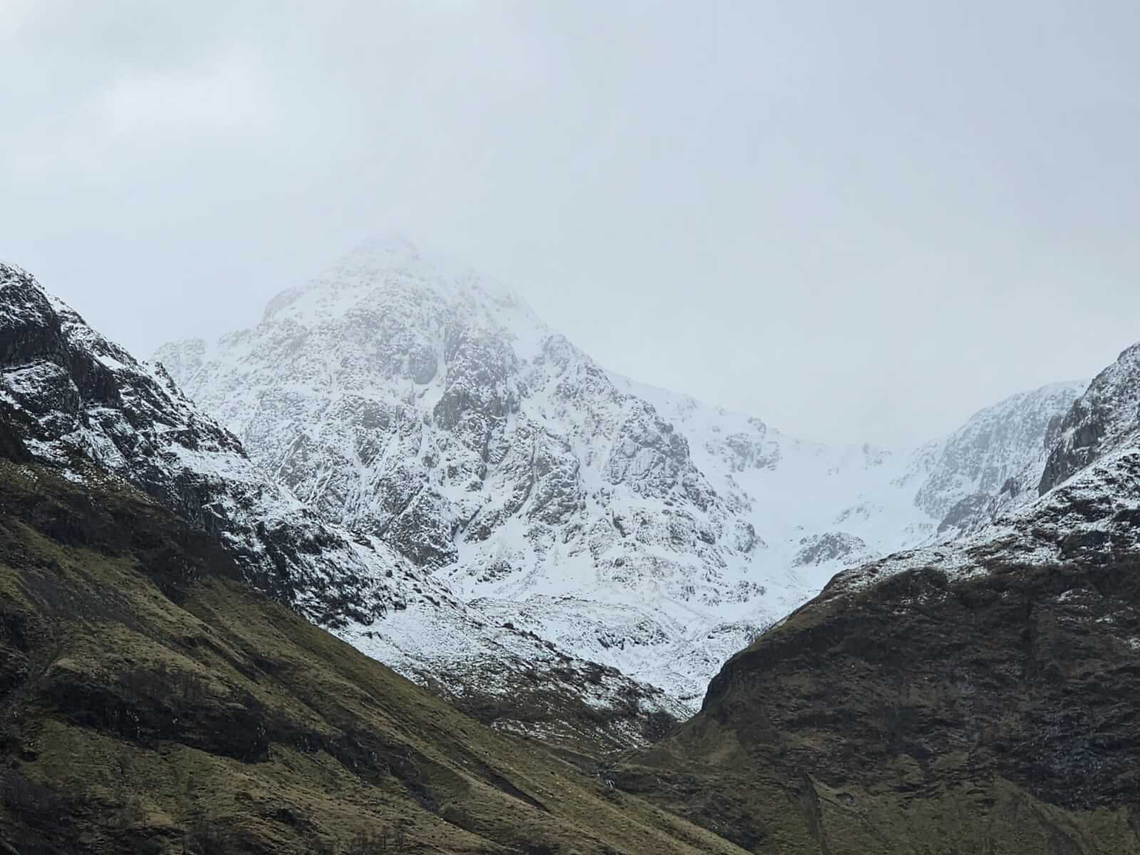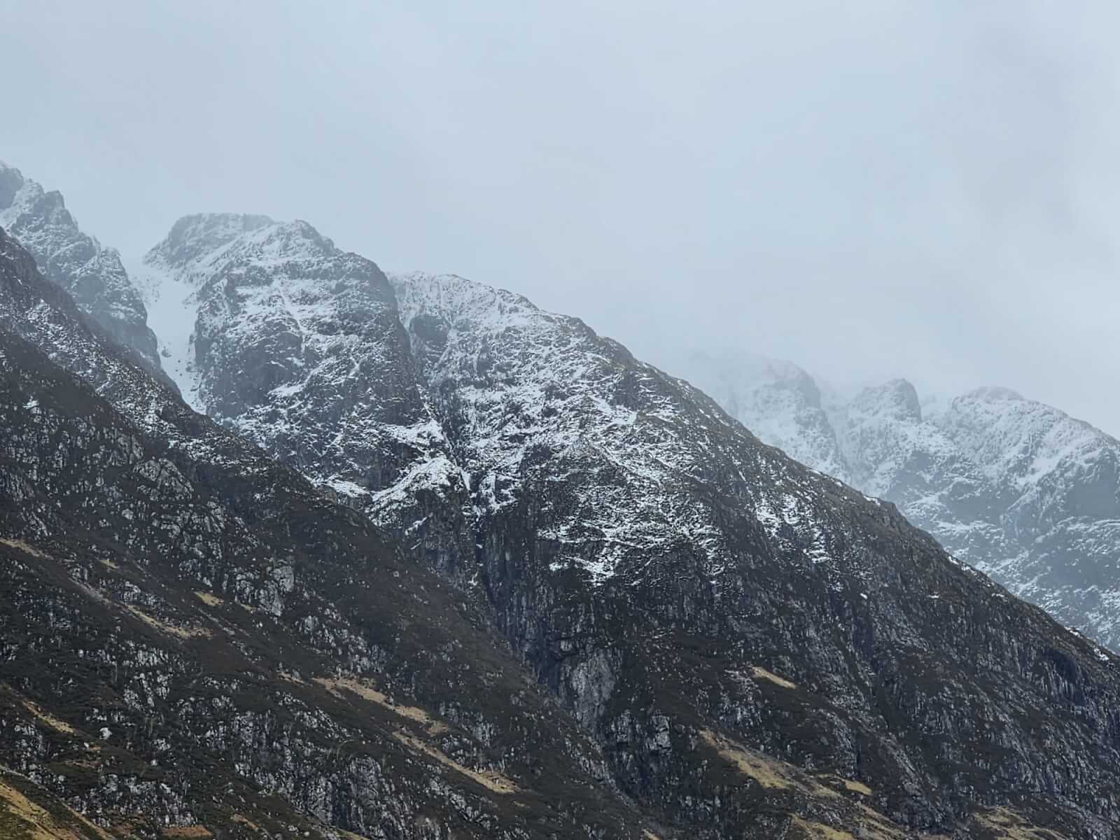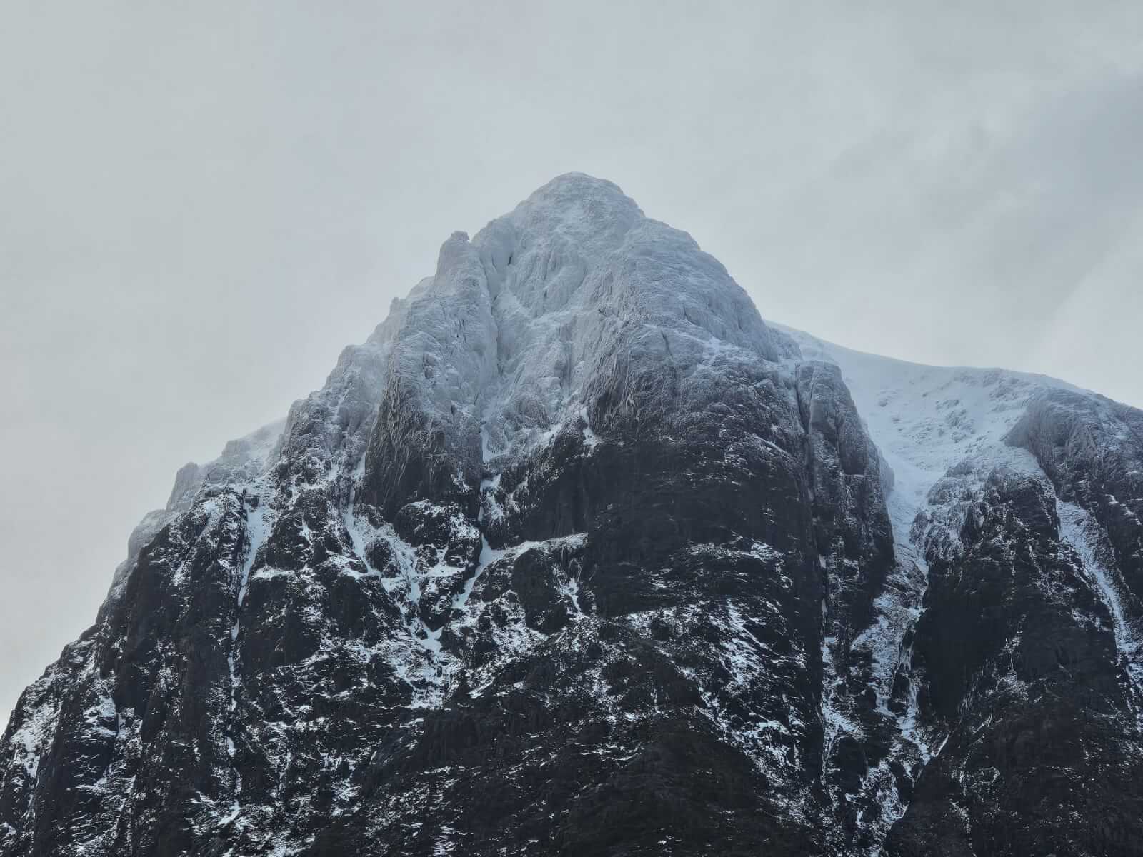 The upper elevations of Stob Dearg, Buachaille Etive Mor, a wintery defined Crowberry Ridge and tower.