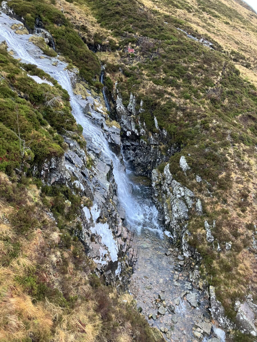 Plenty of snow melt running off the hills in the mild conditions but still remnants of ice still persisting particularly on paths and hillsides.