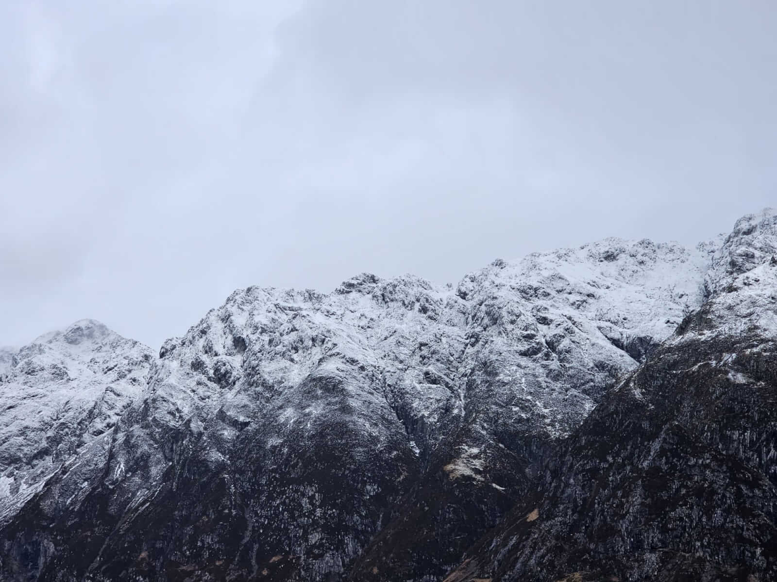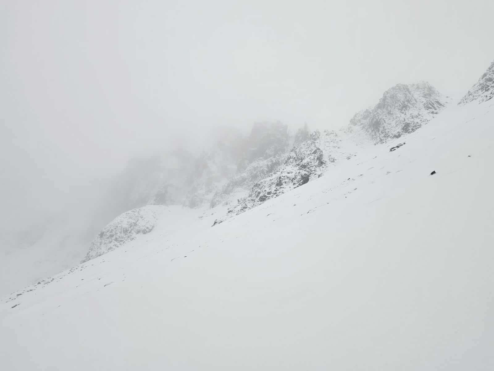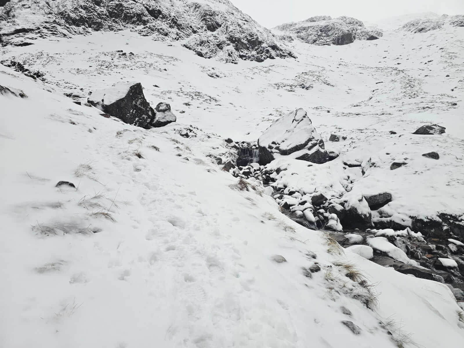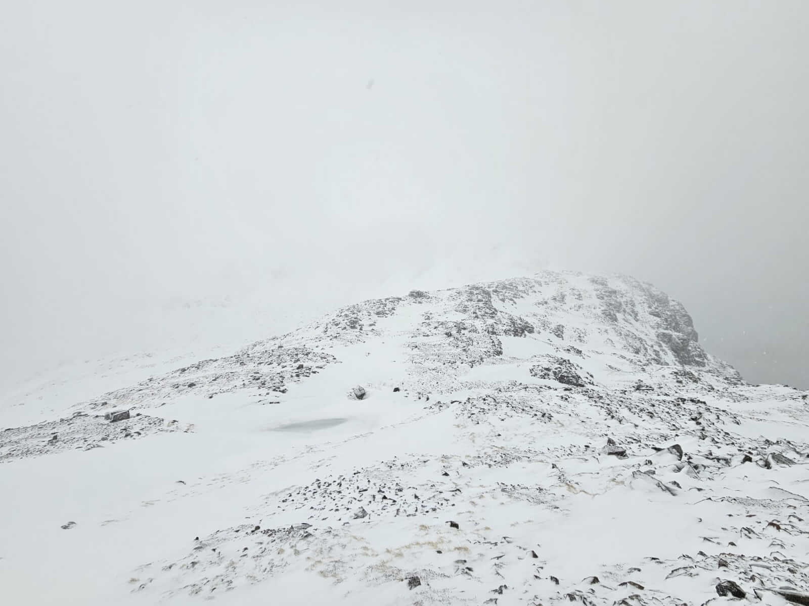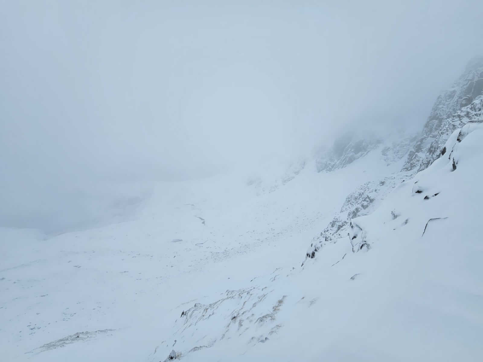Arriving in the coire just after the snow started falling late morning. All a bit white up here.