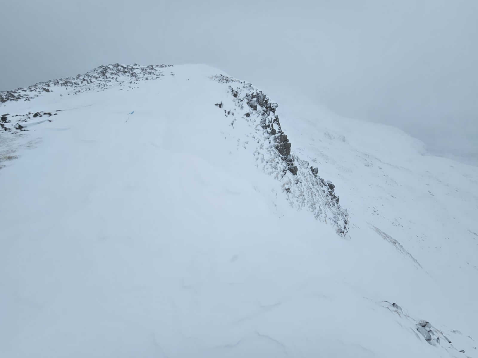 Not obvious on the photo but notable cornices have formed, here on an easterly aspect at 960 metres. Looking back towards Aonach Dubh which is behind the fore ground.