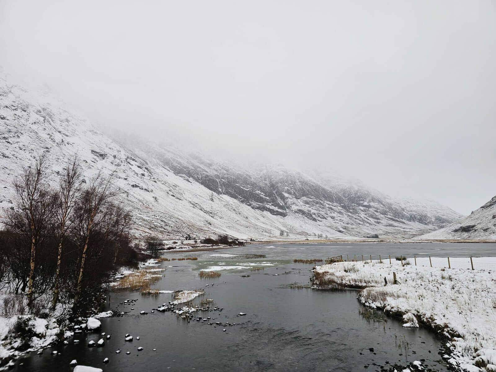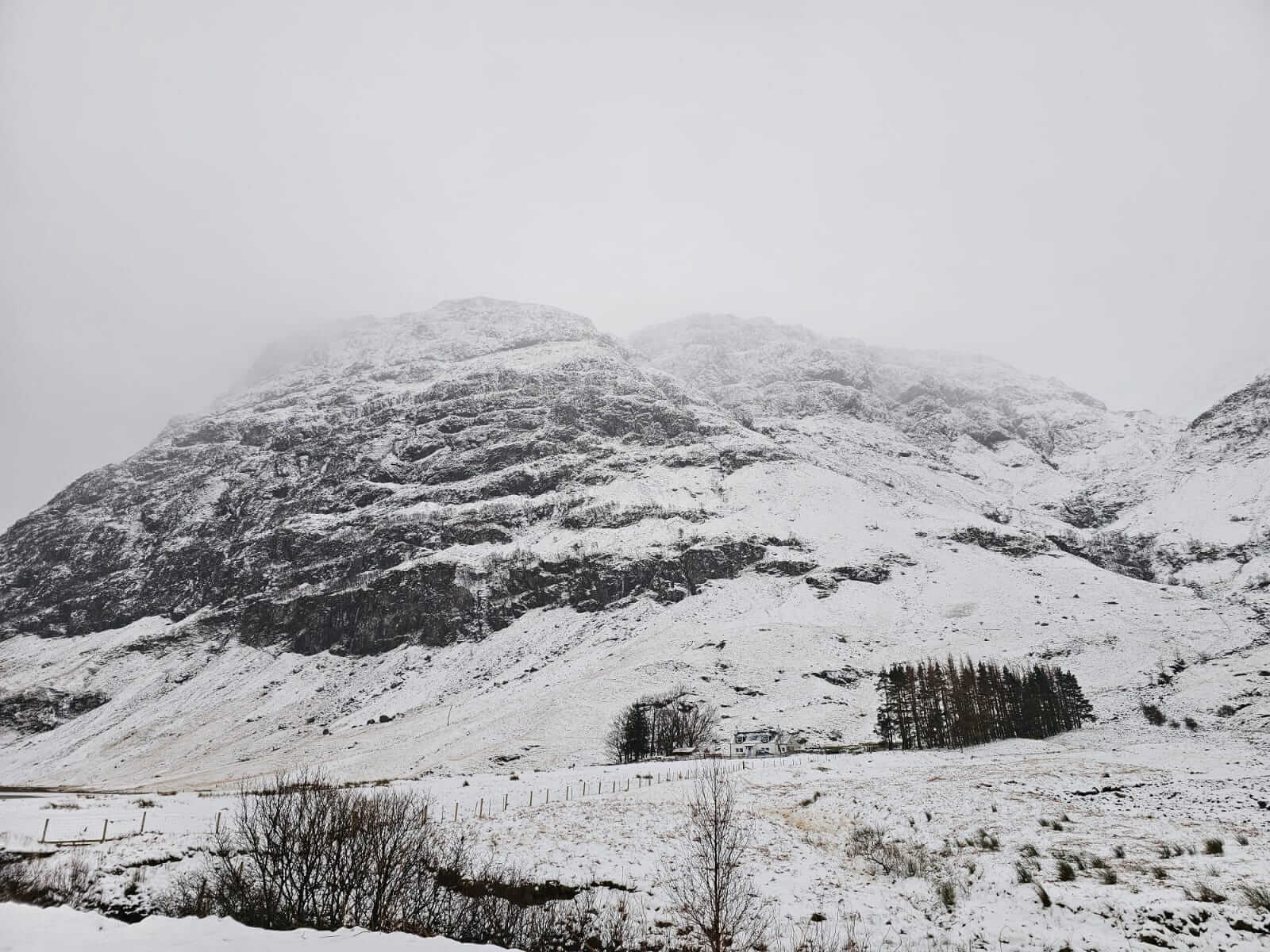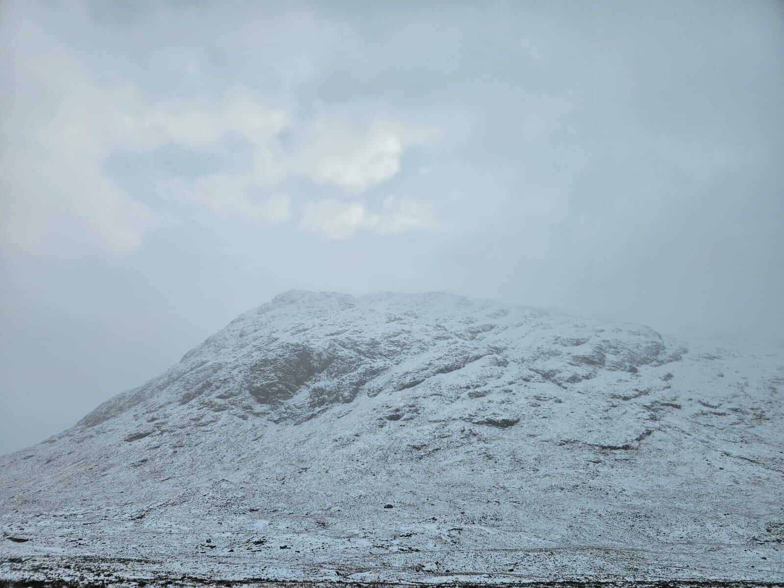 What a difference a day makes, low cloud, snow and poor visibility. Looking over Loch Atriochtan up the ‘Glen’.