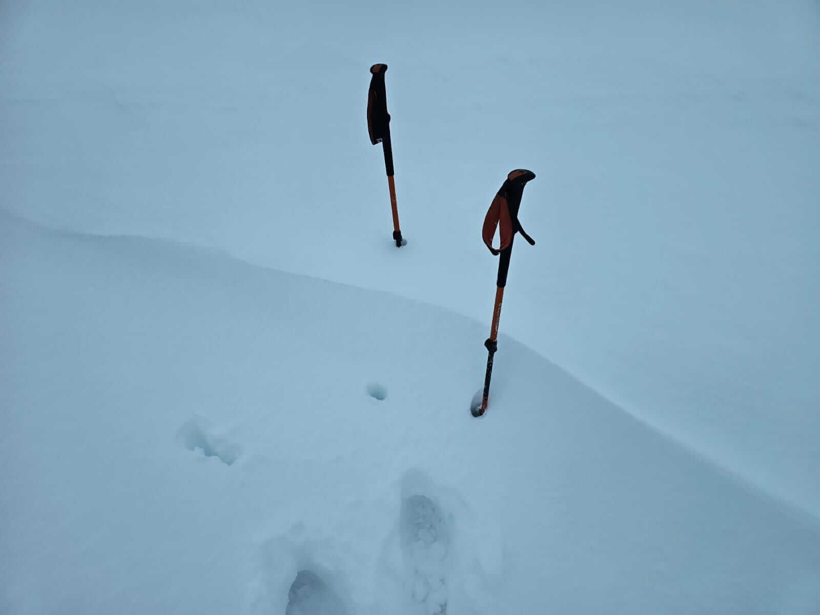 Deeper drifts in places, this on a north aspect at about 850 metres. Walking really quite challenging today with each step a pot luck of soft snow through to ice/rock/hole/grass/flat/sloped….