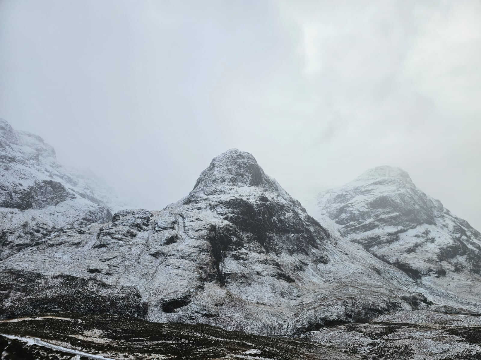 A glimpse of the ‘Sisters’ still looking whiter this afternoon whilst heading back down the glen in thawing conditions.