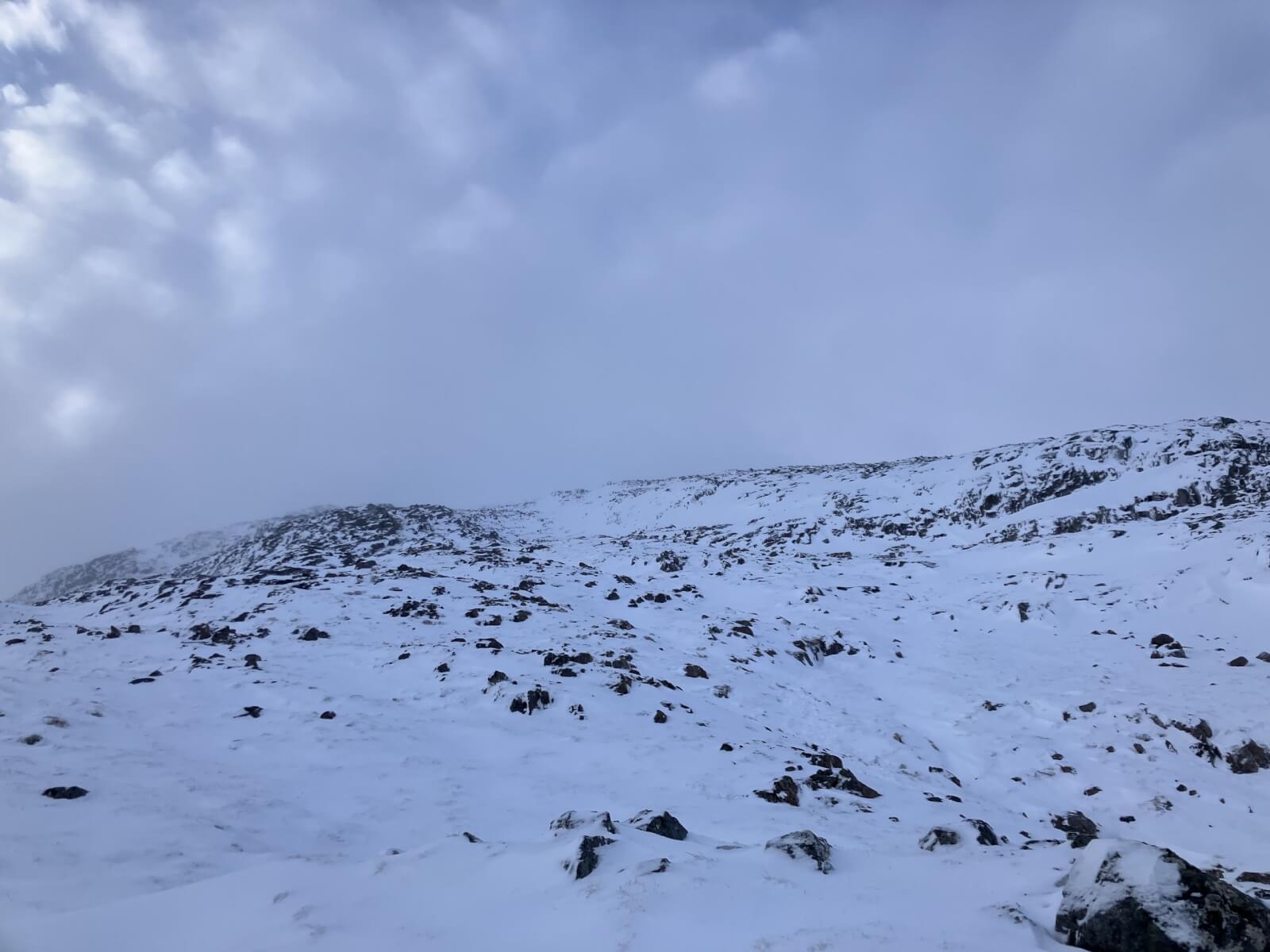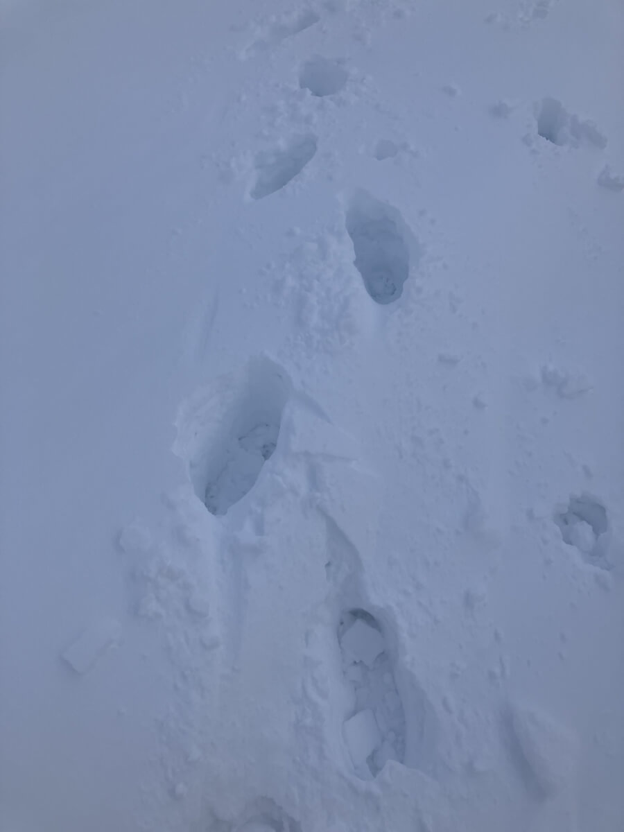 Snow cover here above 850 metres it is still generally unconsolidated breaking through to bare ground.