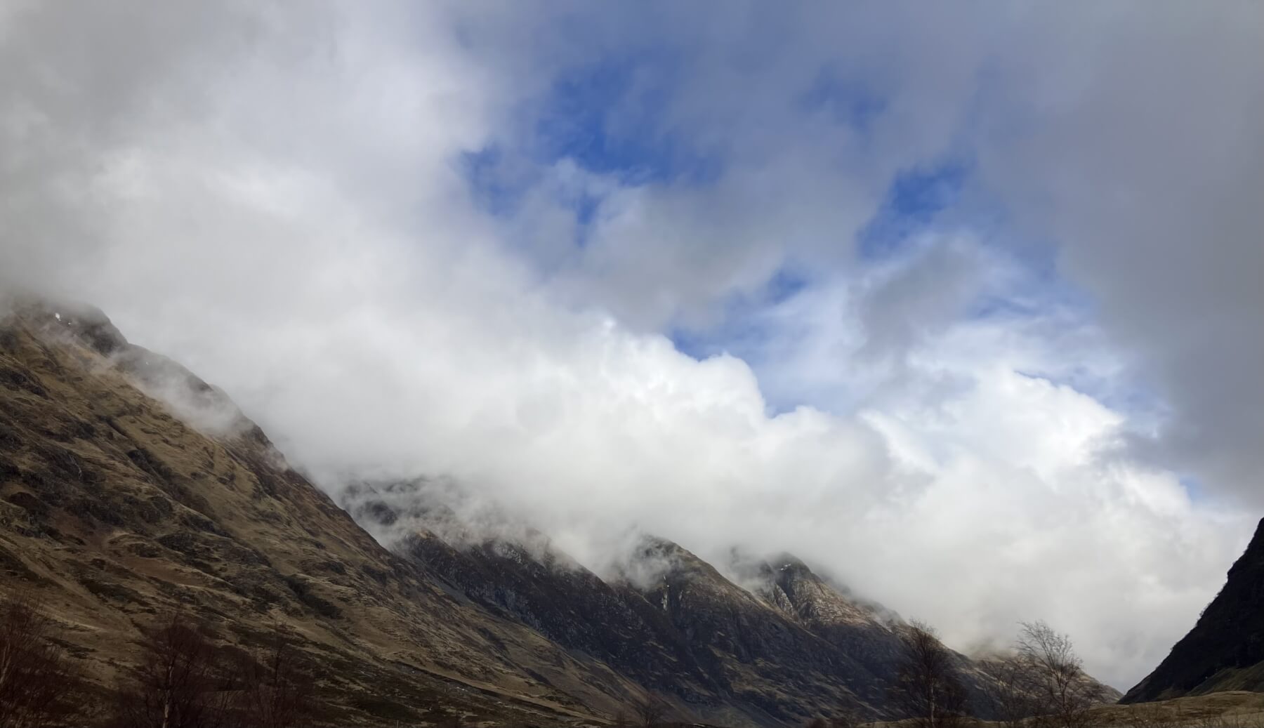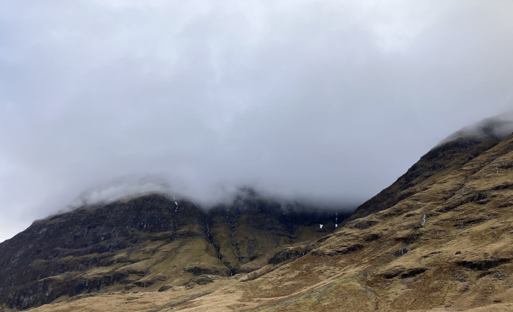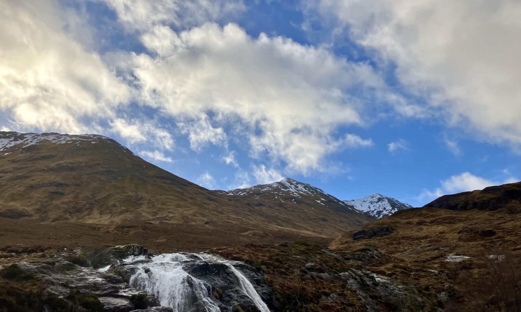 The waterfall at “the meeting of the 3 Waters” with Buachaille Etive Beag hills capped with some snow.