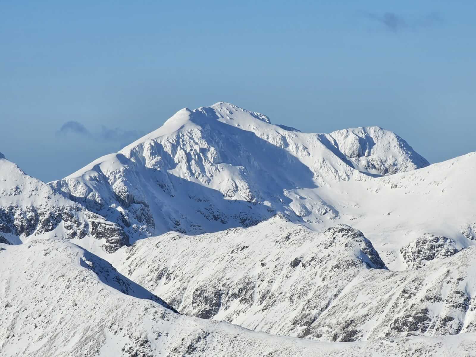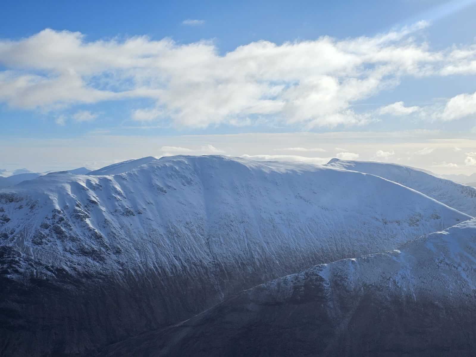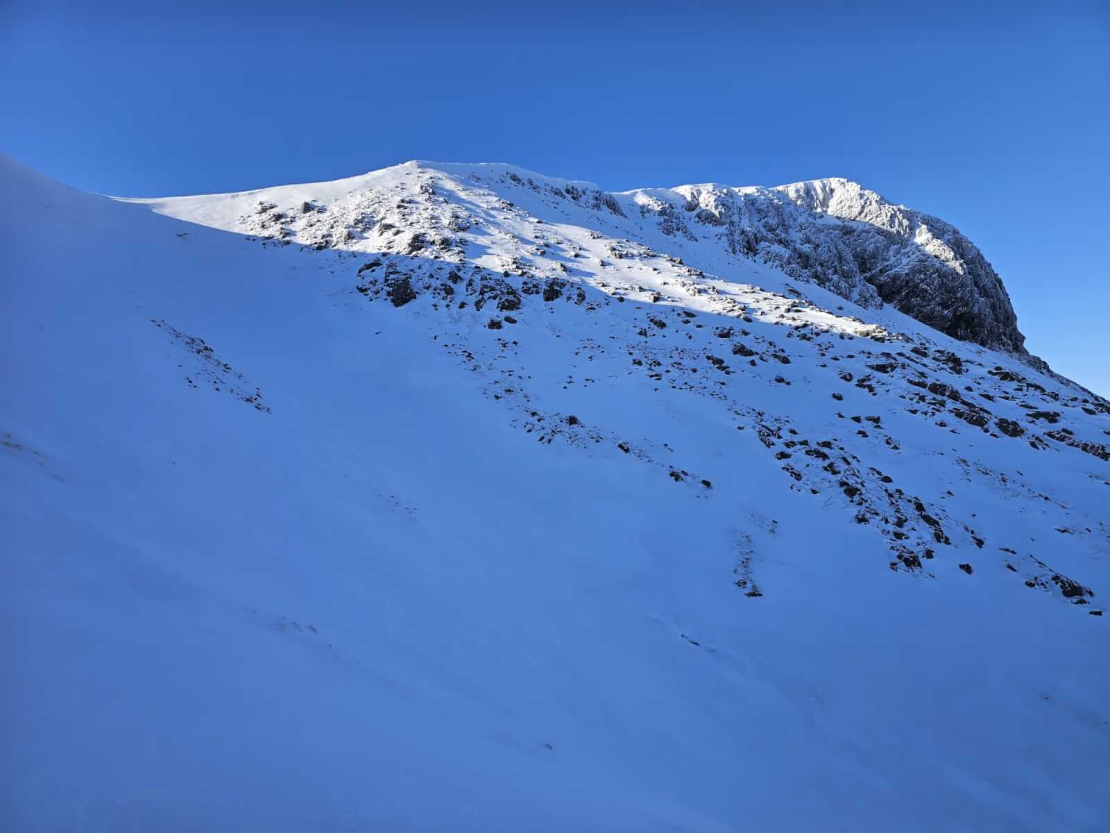 Upper elevations of Coire Altruim and the summit buttress of Stob Coire Altruim. Small cornices on these high aspects.