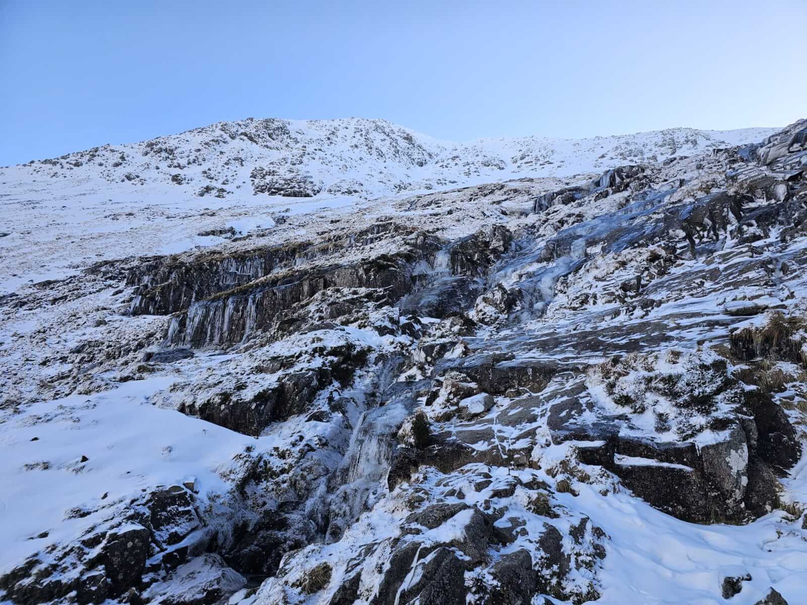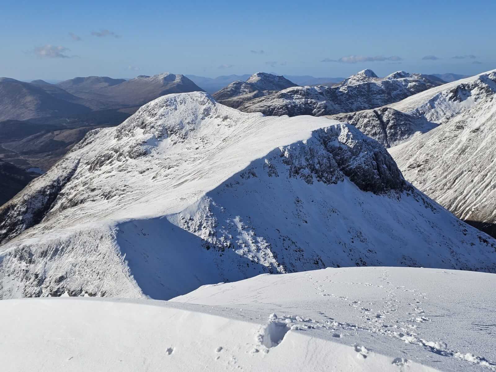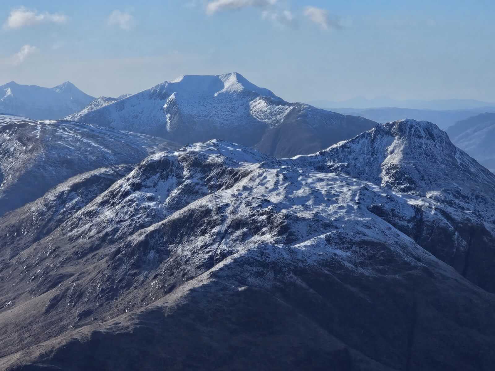 Upper elevations of Coire Altruim and the summit buttress of Stob Coire Altruim. Small cornices on these high aspects.