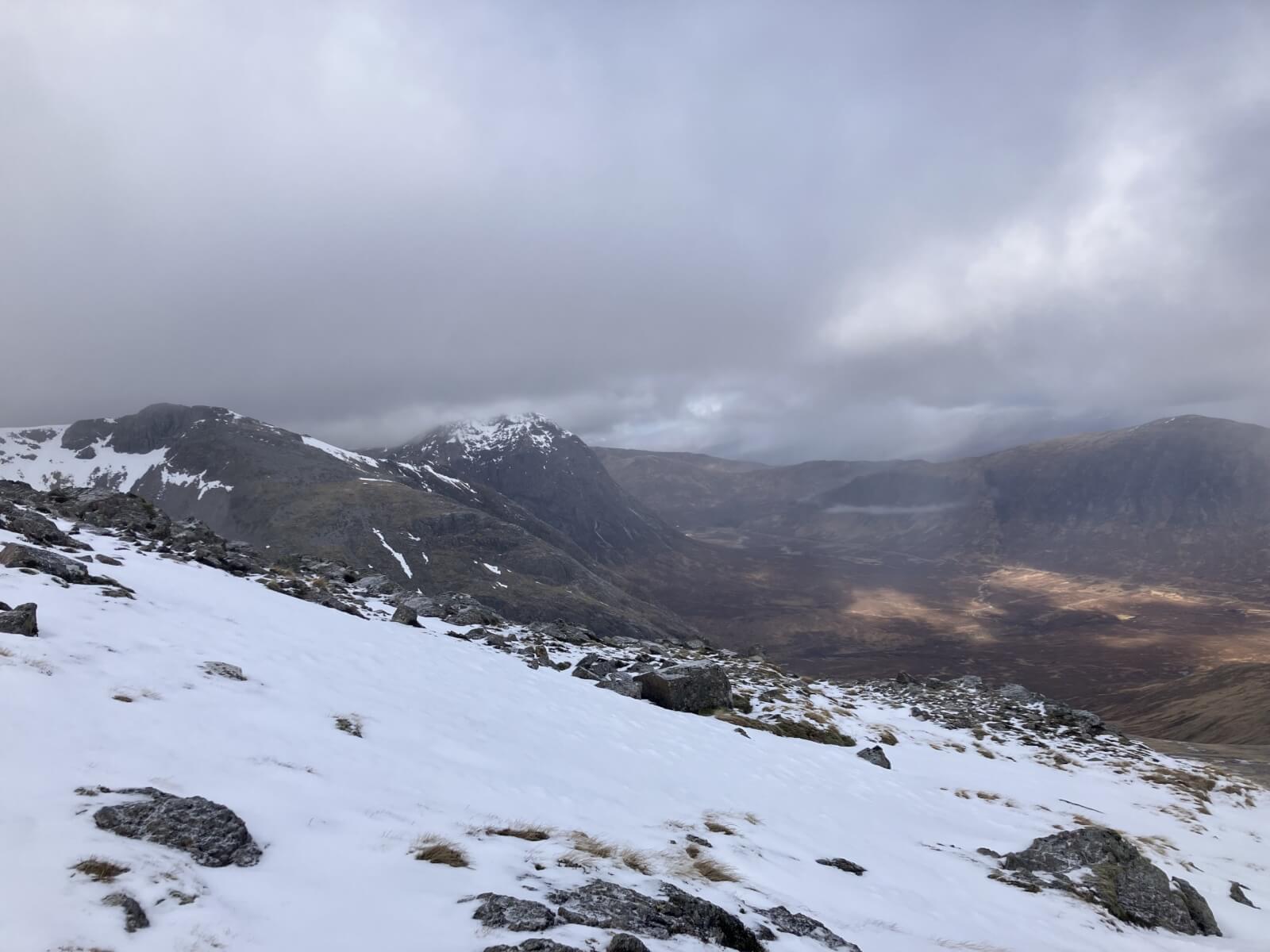Church Door buttress left of the large expanse of snow with Stob Coire nam Beith on the right, nice a clear at this end of the Glen.