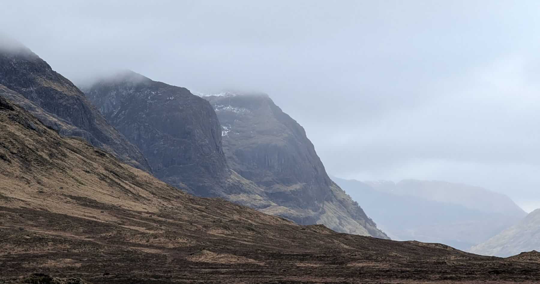 North-Westerly aspect of Buachaille Etive Mor, left. The pass of the Lairig Gartain goes through to Dalness in Glen Etive.