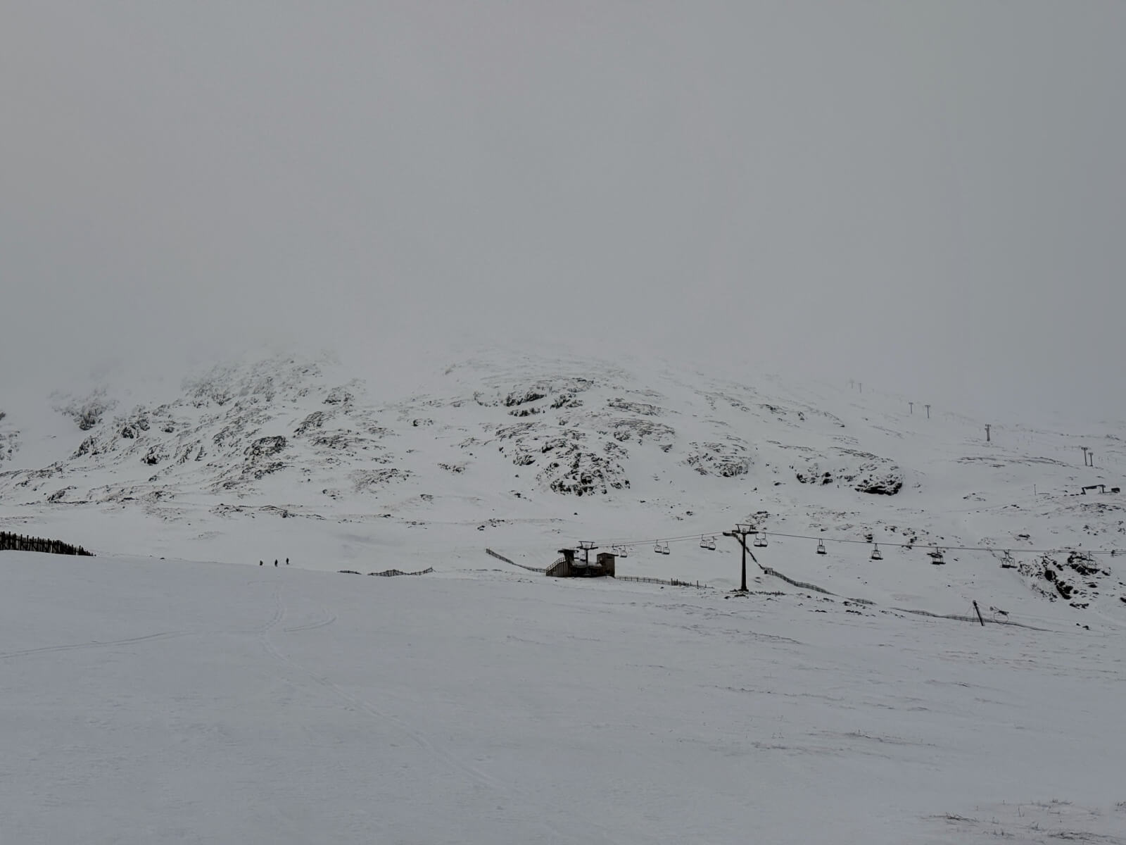 Looking past the chairlift to the East face of Stob a’Ghlais Choire, debris from 2 avalanches visible in the centre and cornices visible round the coire rim.