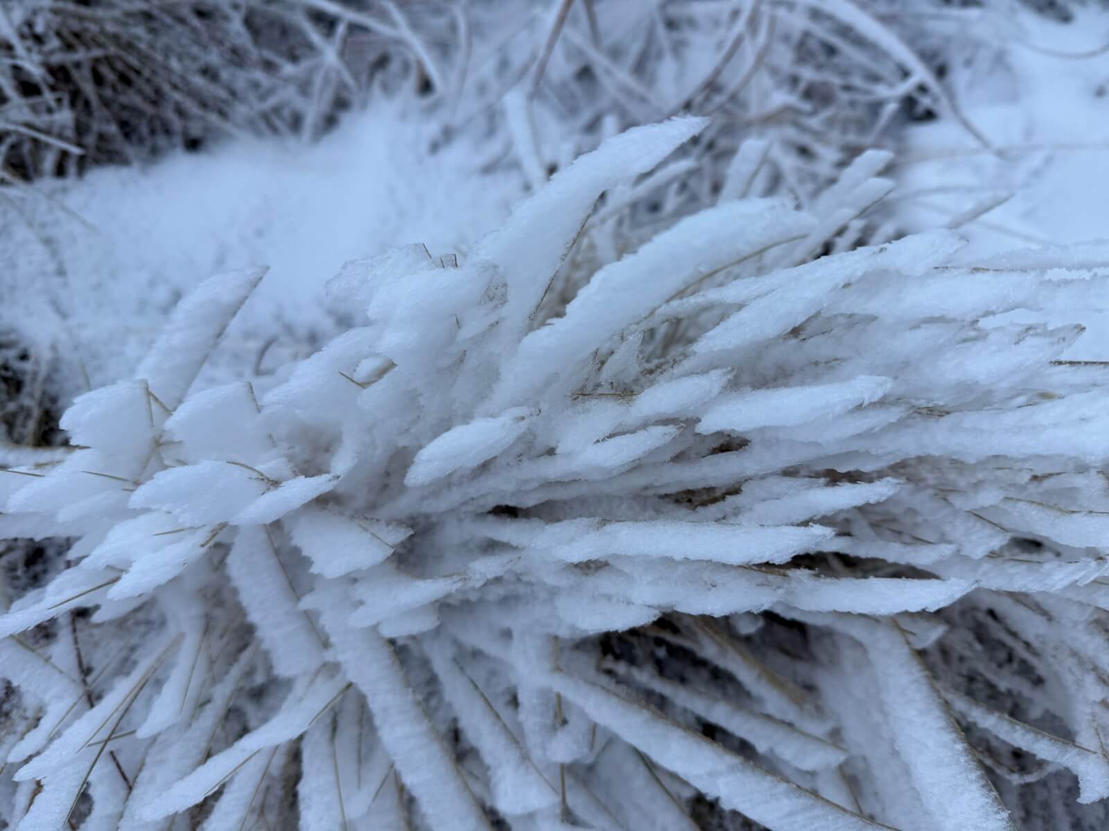 Rime on grass at around 700 metres, this has grown rapidly as the freezing level fell overnight, there was no rime here yesterday.