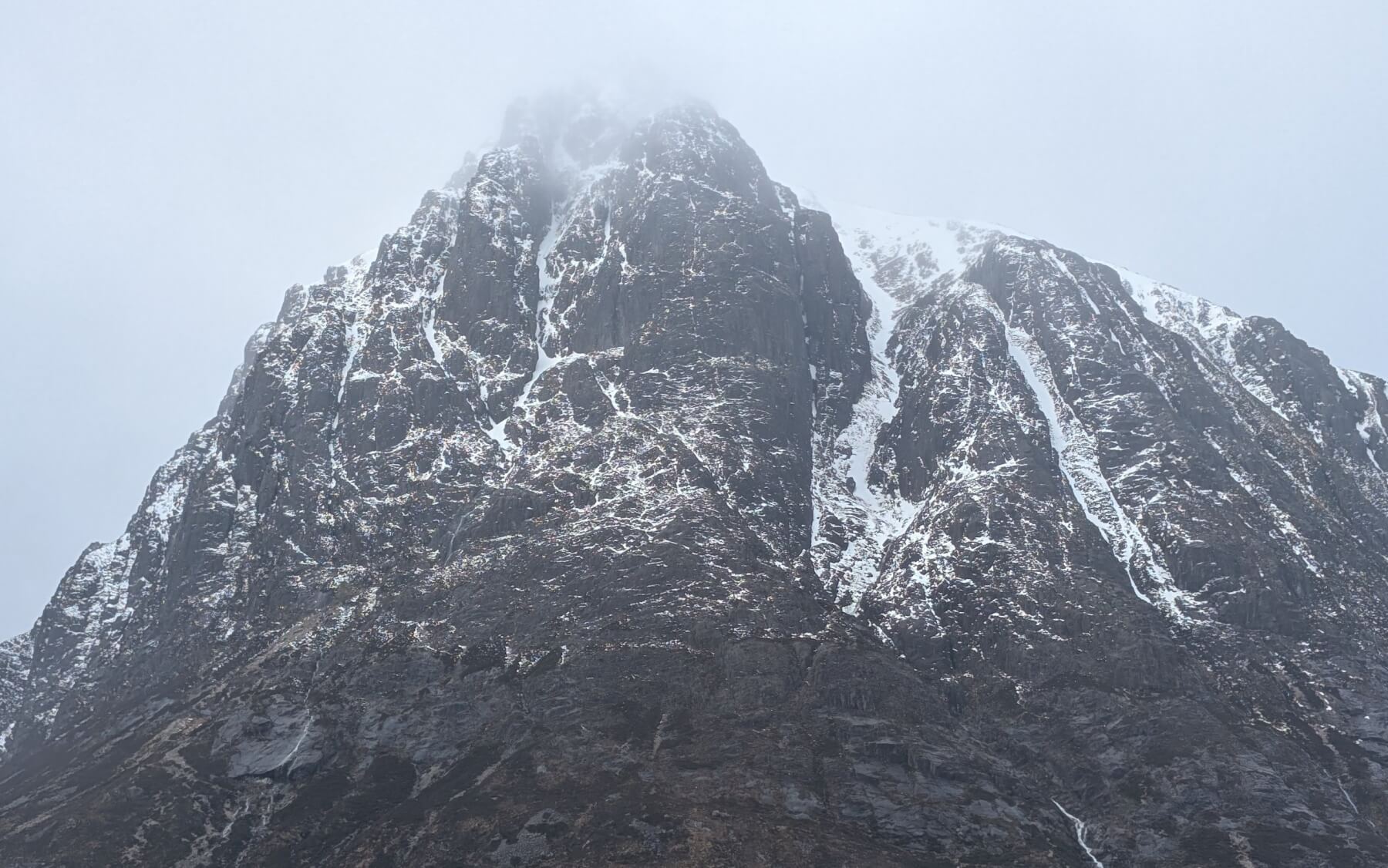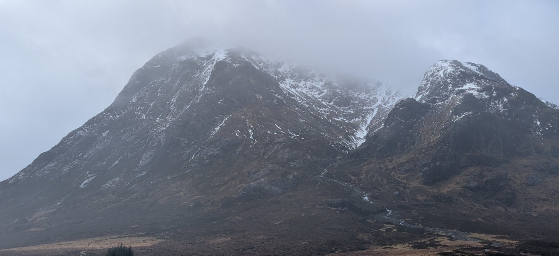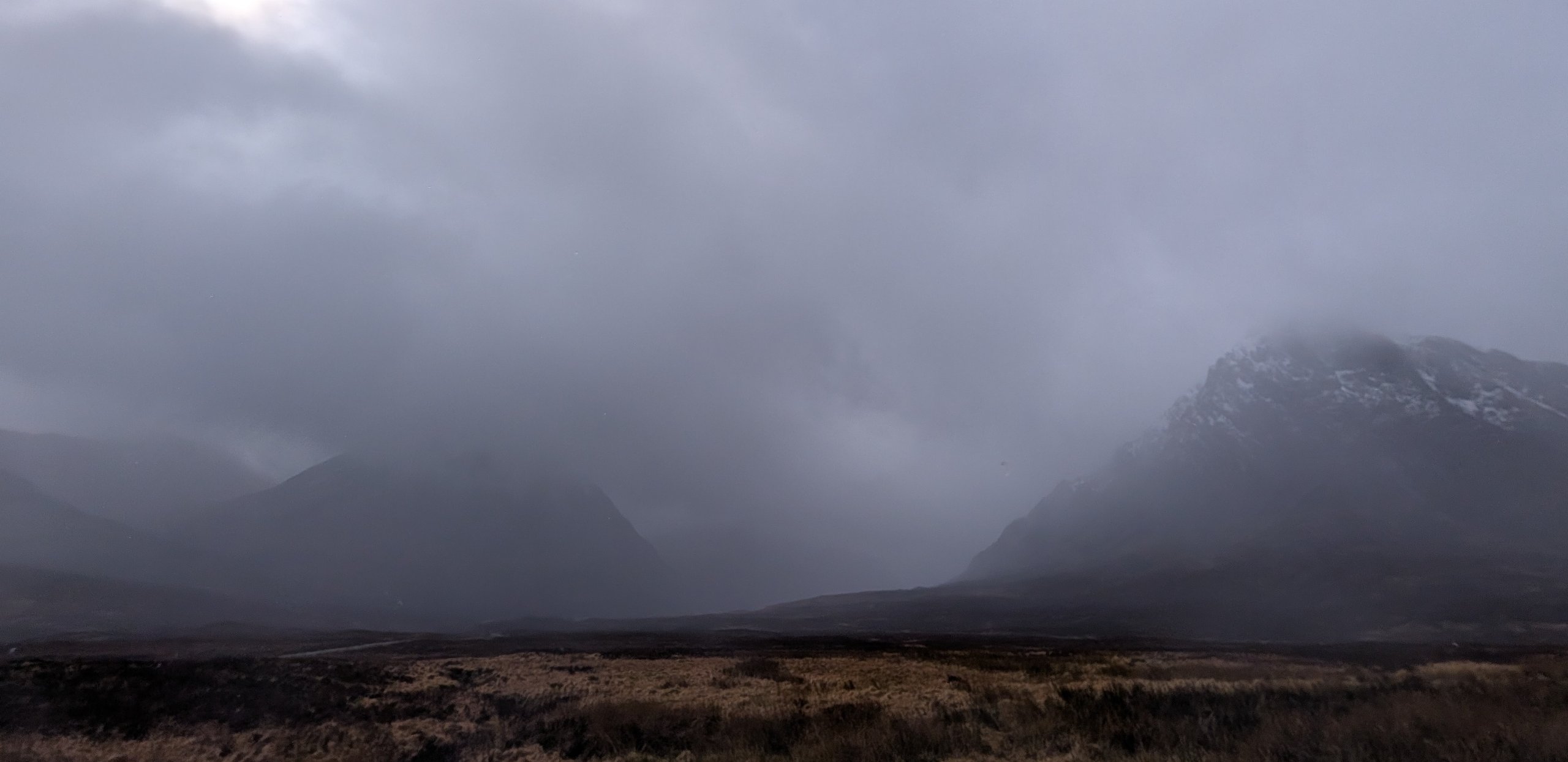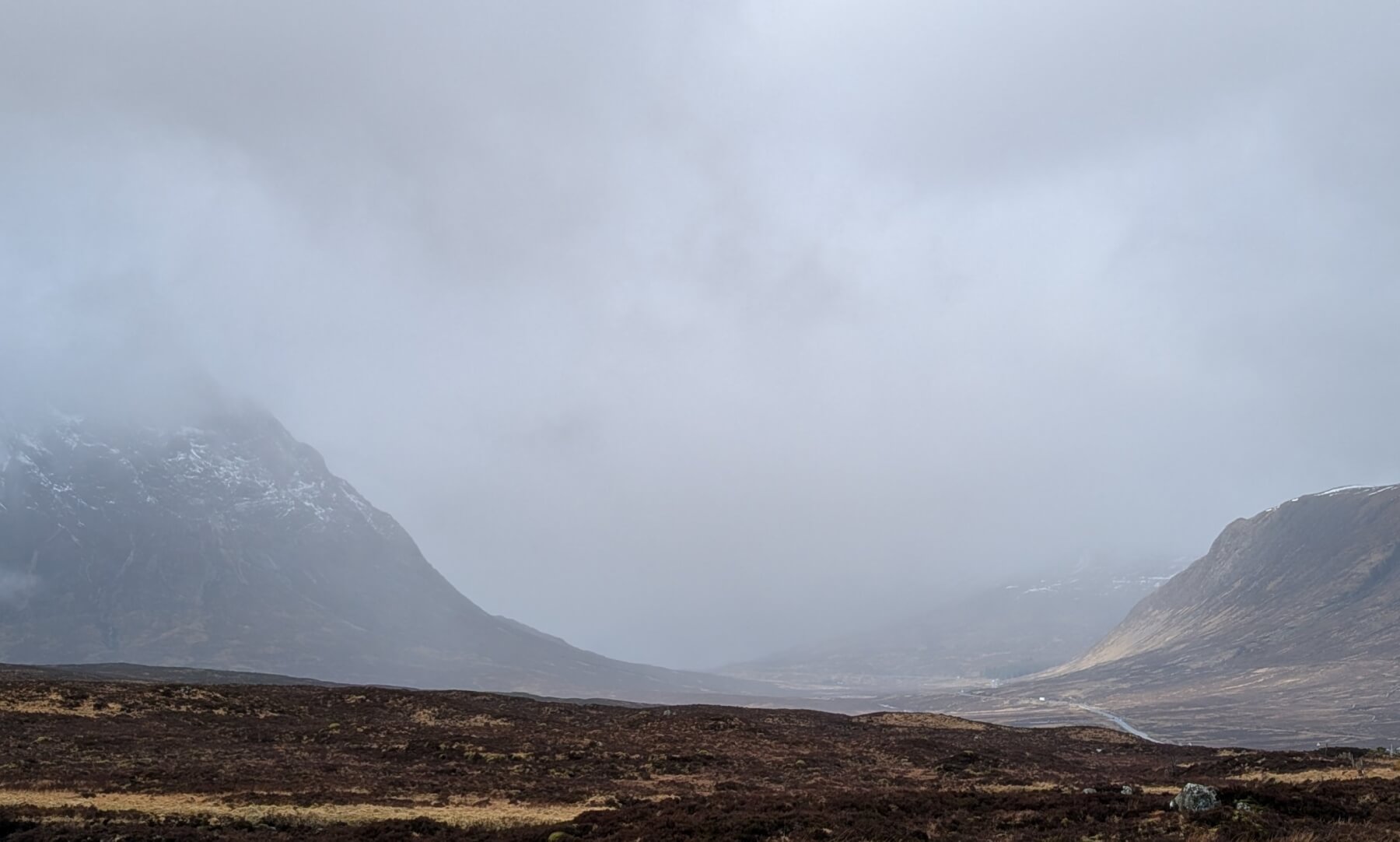 Limited visibility, Meall a Bhuiridh left, Stob Dearg on the right. Photo looking South-Westerly towards Glen Etive.