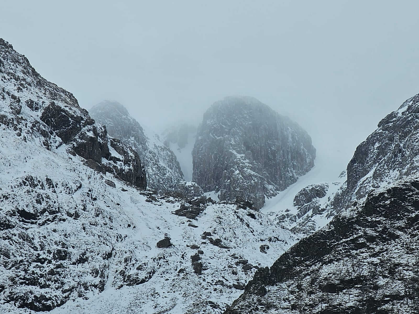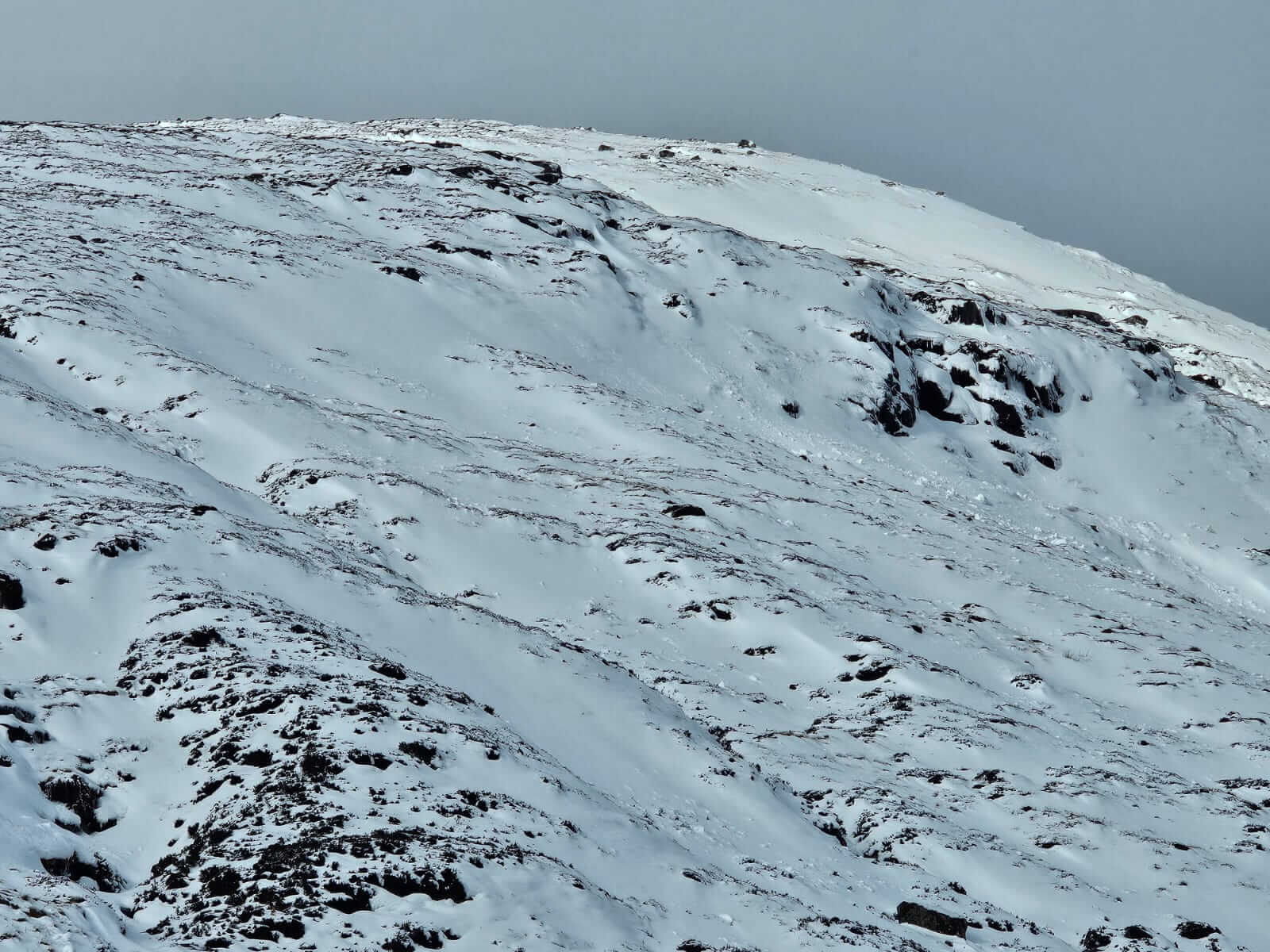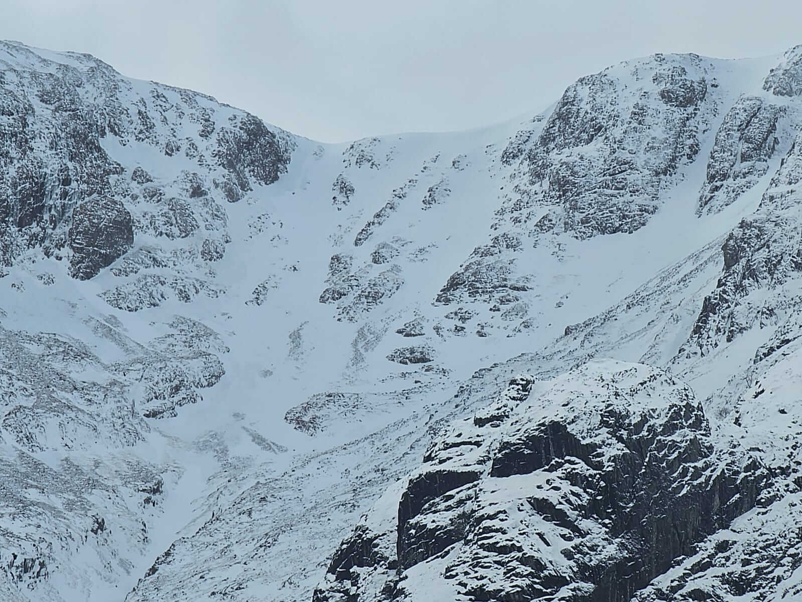 Some distinction can be seen between the old icy wind scoured snowpack and the fresh deposits in Coire na Tulaich.